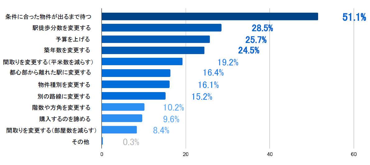 やはり半数以上の方が「条件の合った物件がでるまで待つ」と回答。