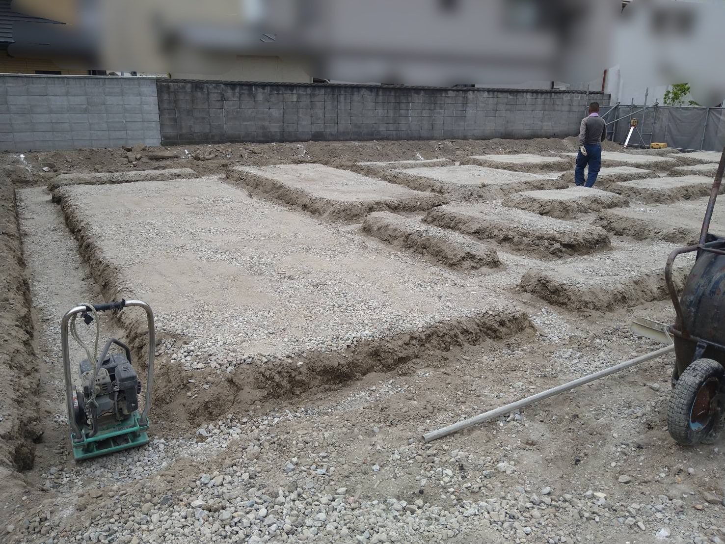 根切り(掘削工事)の後、砕石と呼ばれる石を敷き詰め、ランマーと呼ばれる機械を使って地盤を締め固めます。