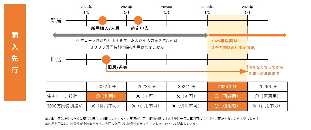 2022年に新居を購入して、「ローン控除」を利用開始したのであれば、「他控除制度の利用年、およびその前後2年以内は利用不可」ですから、「ローン控除」利用開始した2022年と、後の2年(2023年と2024年)は「3千万控除」は利用できず、2025年以降から解禁されます!