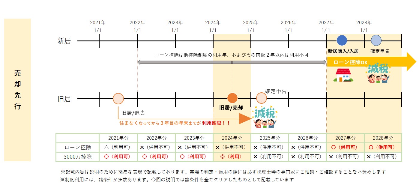 住宅借入金等特別控除(以下「ローン控除」と表記)と、居住用財産を譲渡した場合の3,000万円の特別控除の特例(以下「3千万控除」と表記)は、2023年時点では同タイミングで併用利用ができません。