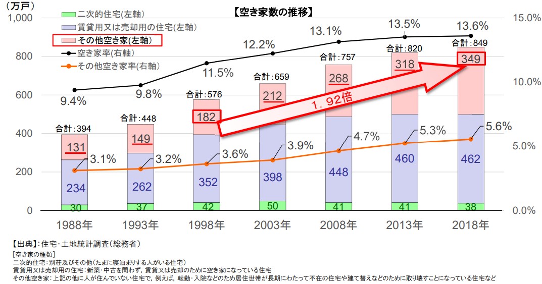 その証拠に、住宅・土地統計調査(総務省2018年)によると、全国空家は849万戸と、実は人口減少スピード以上に年々増加しています。