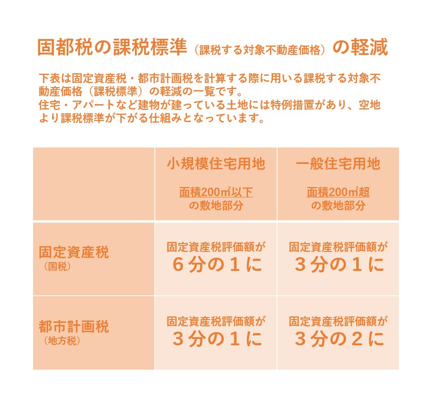 ただし、住宅・アパートなど建物が建っている土地には特例措置があり、以下の表のように安く抑えられています。