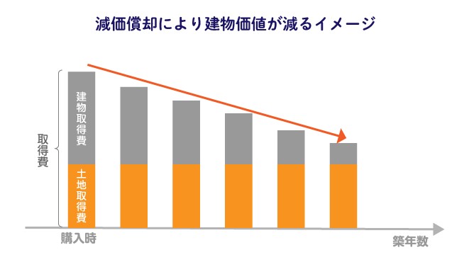 また建物評価額は、築年数(経年)に応じて減価していきます。これを「減価償却(消費材として年々劣化減価するものとみなして計算する会計上の仕組み)」と言います。