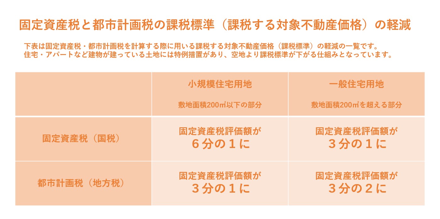 地目が「宅地」の場合、さまざまな建築物が建築できる(建築基準法に基づく建築)と説明しました。建築可能な土地ですから、更地(空地)のままではなく、住宅・アパートなど種類を問わず建物が建っているほうが、特例措置によって土地評価が大きく軽減されます。